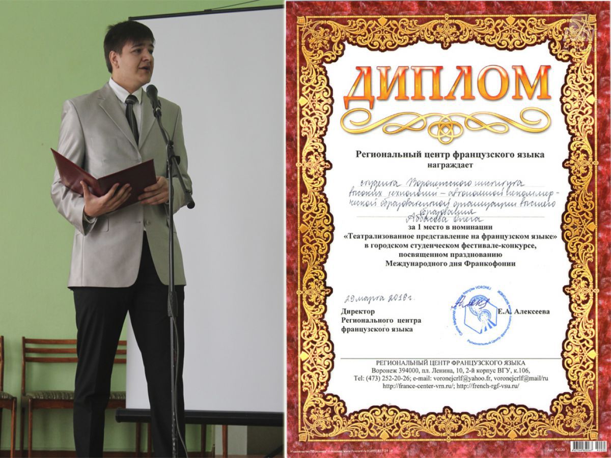 Ежегодно Региональный центр французского языка проводит фестиваль-конкурс, посвященный Международному дню Франкофонии. В празднике, посвященном празднованию международного дня Франкофонии, традиционно принимают участие и становятся лауреатами студенты Воронежского института высоких технологий, изучающие французский язык в качестве первого или второго иностранного языка. В этом году в конкурсе принимал участие и занял 1 место в номинации «Театрализованное представление на французском языке» студент направления «Информационные системы и технологии» Аббасов Олег.